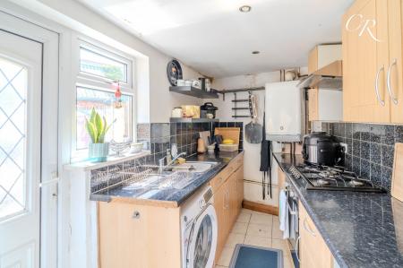 Kitchen: Off the dining room, the separate kitchen comprises tiled flooring and marble effect tiled walls, along with a gas stove and ample storage. A door provides direct access to the sunny rear courtyard garden.