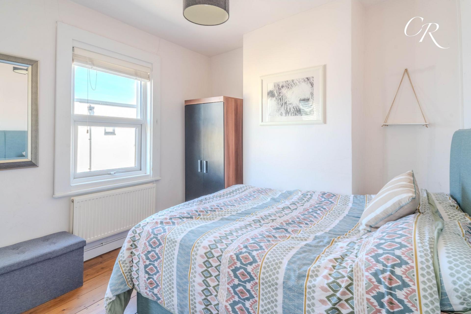 Bedroom One: The main bedroom is generously proportioned and features original wooden flooring, double windows to the front, and neutral decor, offering a bright and comfortable retreat.