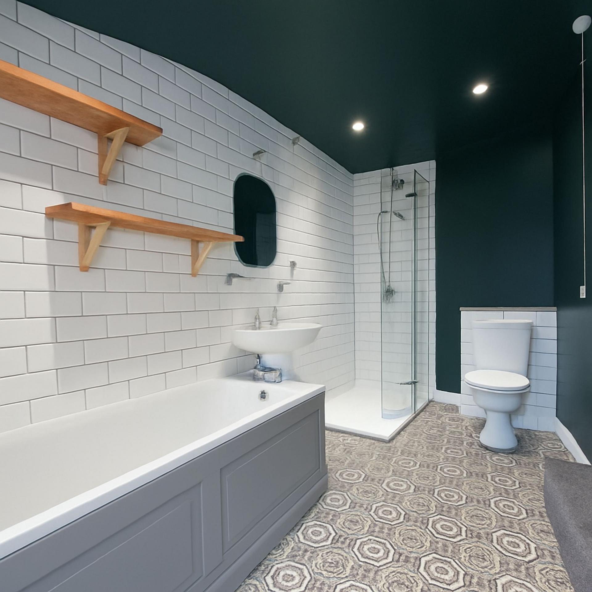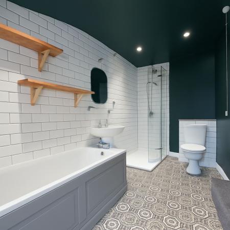 Bathroom: Stylishly refurbished, the bathroom includes a white suite with a bath, separate walk in shower, white tiled walls, and decorative patterned floor tiles. A white basin and WC complete this elegant space.