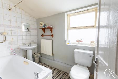 Bathroom: Fitted with a white suite comprising bath with shower over, pedestal wash hand basin and WC, complemented by a window to the rear allowing for natural light and ventilation.