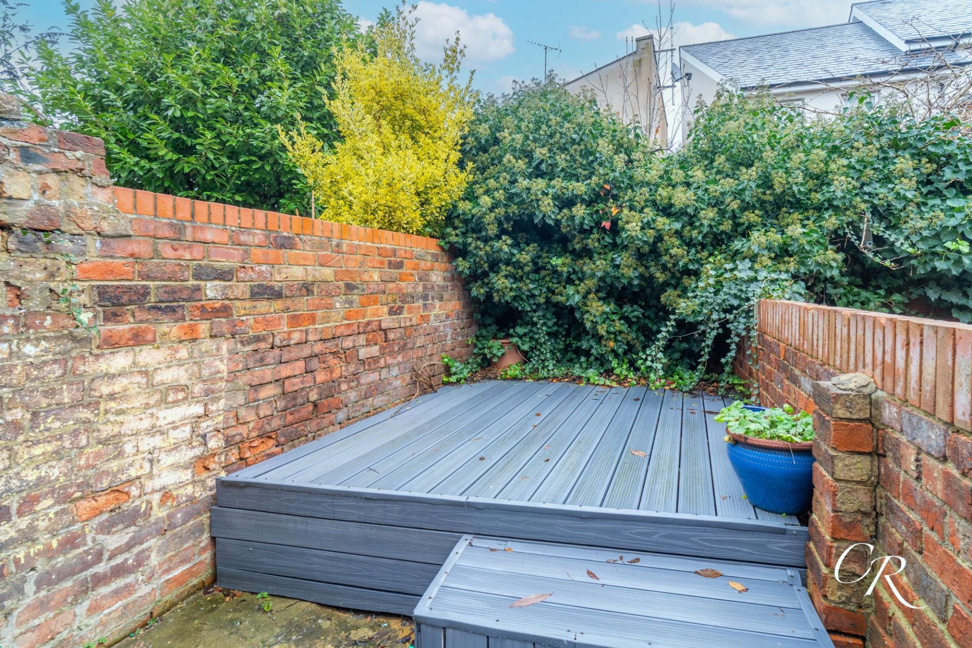 Garden: To the rear is an enclosed courtyard garden featuring a paved patio area and a raised decked section, ideal for outdoor dining and entertaining.