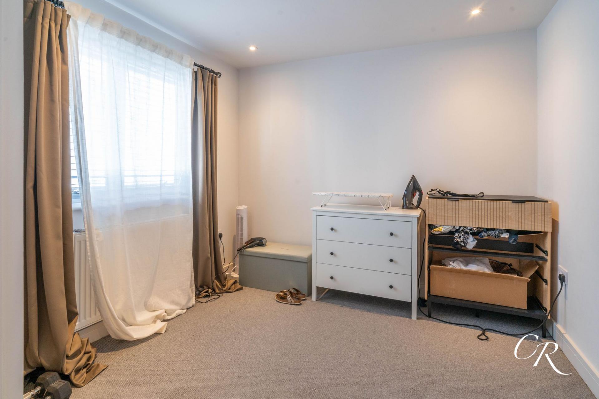 Bedroom One: A generous double bedroom located at the front of the property, featuring built in storage and an ensuite shower room. The space is well lit by a wide window and decorated in fresh neutral tones.