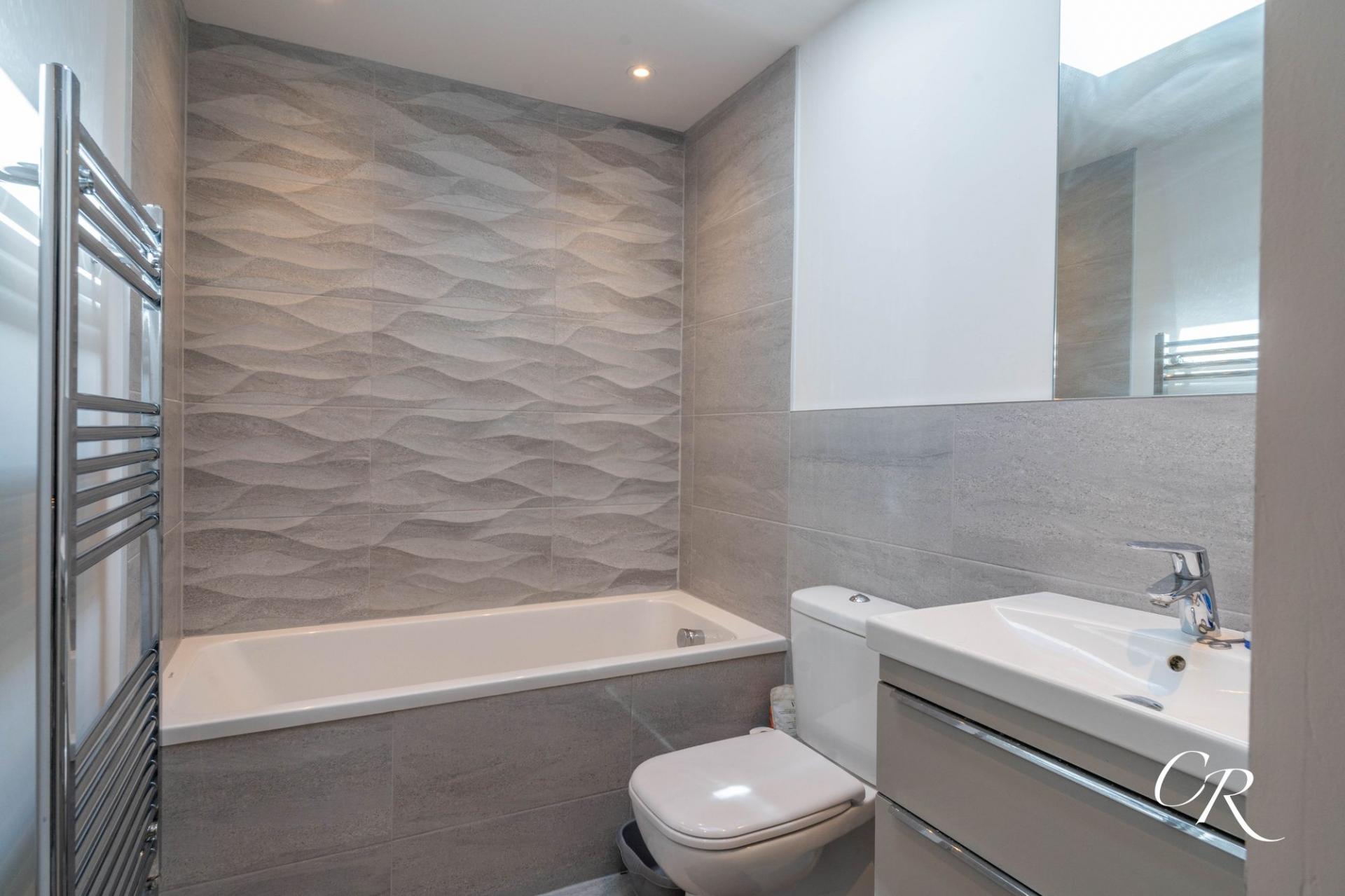 Bathroom: The main bathroom is fitted with a full size bath with overhead shower, vanity unit with basin, WC, and heated towel rail, all presented in a modern, low maintenance style.