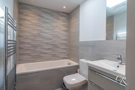 Ensuite: Finished with contemporary tiling, the ensuite includes a walk in shower, vanity unit with integrated sink, WC, and heated towel rail.