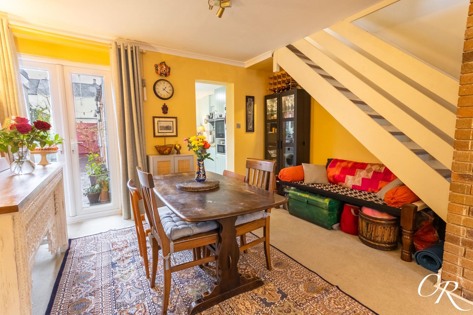 Sitting Room / Dining Room: The ground floor reception space is arranged in an open-plan layout with the sitting room flowing seamlessly through to the dining room, creating a versatile living area ideal for both relaxing and entertaining. The sitting area is positioned to the front of the property and features an attractive focal point fireplace, along with built-in shelving to the alcoves and a large window allowing natural light to fill the space. The dining area sits to the rear and offers plenty of room for a family dining table. Double doors open directly onto the courtyard garden, allowing the room to enjoy good natural light and providing an excellent connection to the outside space. There is also useful storage beneath the stairs.
