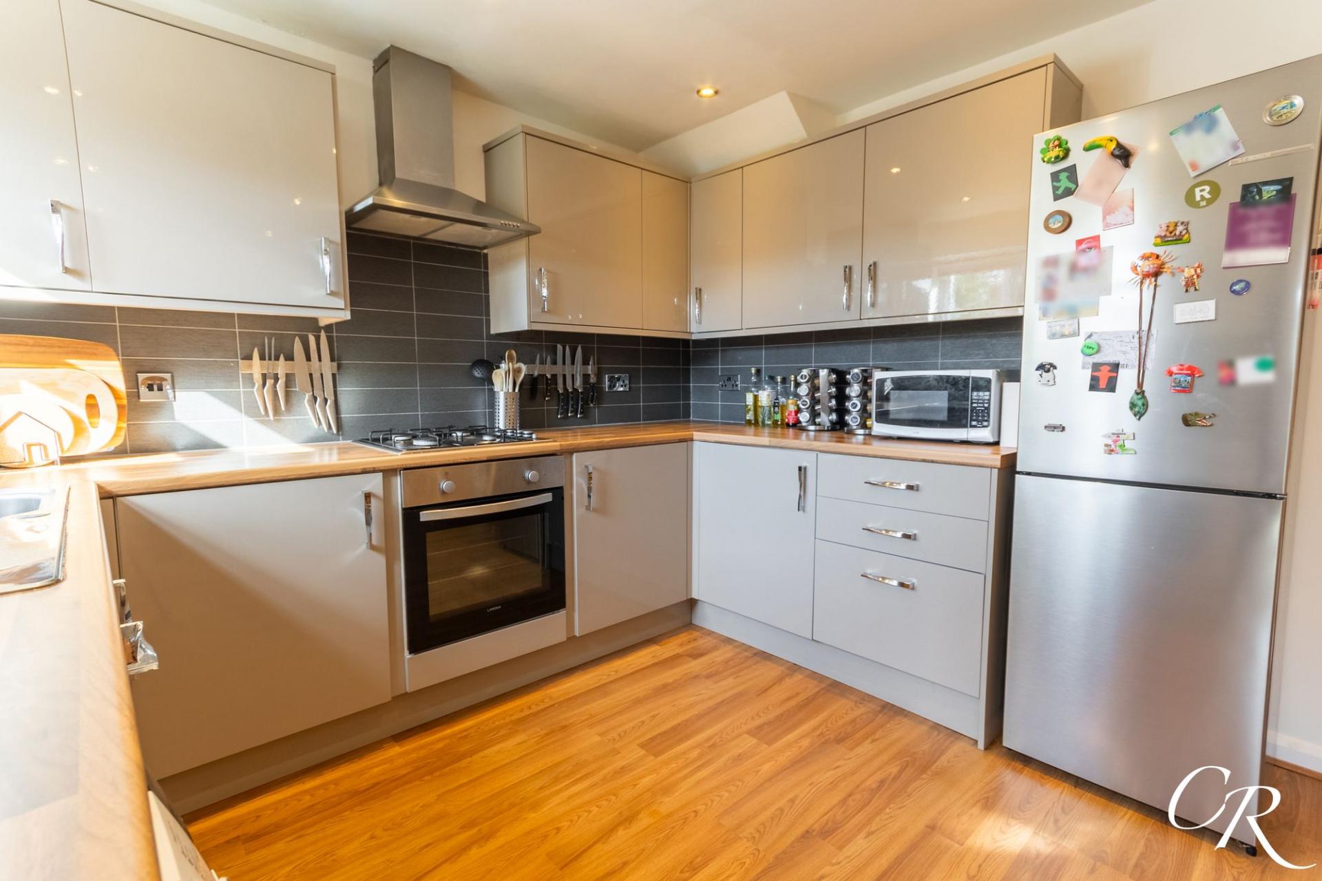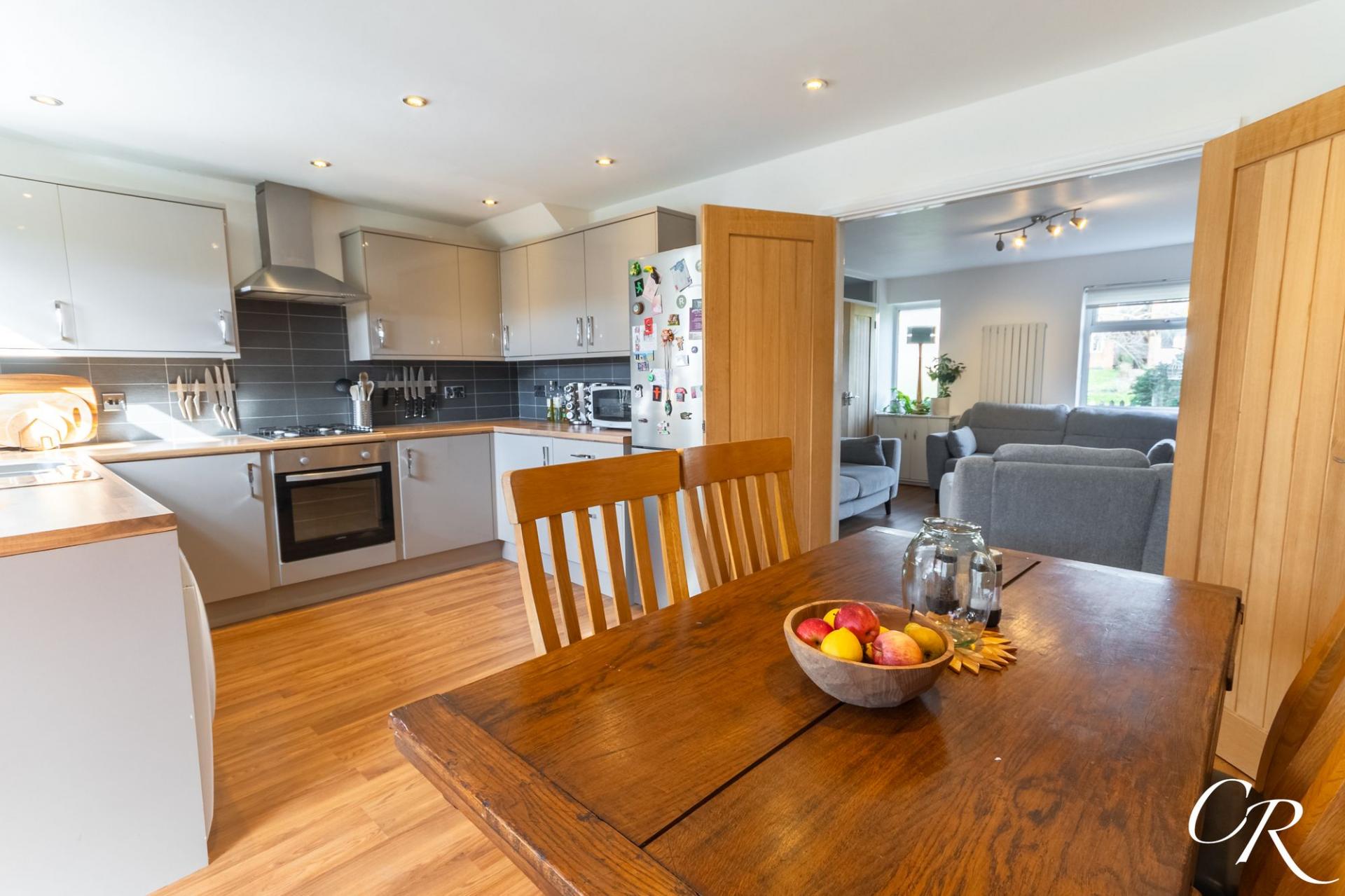 Kitchen/Dining Room: A sociable and well-appointed space fitted with contemporary high-gloss cabinetry, wood-effect worktops and tiled splashbacks. Integrated slimline dishwasher, oven, gas hob and extractor above, with space for freestanding appliances. A rear aspect window overlooks the garden and there is ample room for a family dining table. Double doors lead into the conservatory, naturally extending the living space.