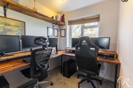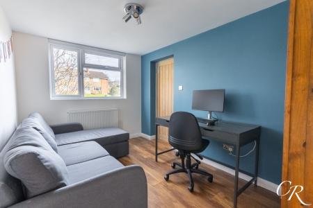 Bedroom Three: A comfortable single bedroom overlooking the rear garden, currently arranged as a home office. The room benefits from a built-in storage cupboard positioned over the staircase, offering valuable additional storage.