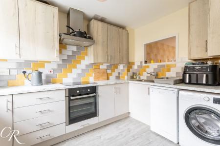 Kitchen: Positioned to the front of the property, the modern fitted kitchen features a range of contemporary wall and base units, complementary work surfaces, tiled splashbacks and an integrated oven and hob. There is space for freestanding appliances, with a window allowing plenty of natural light.