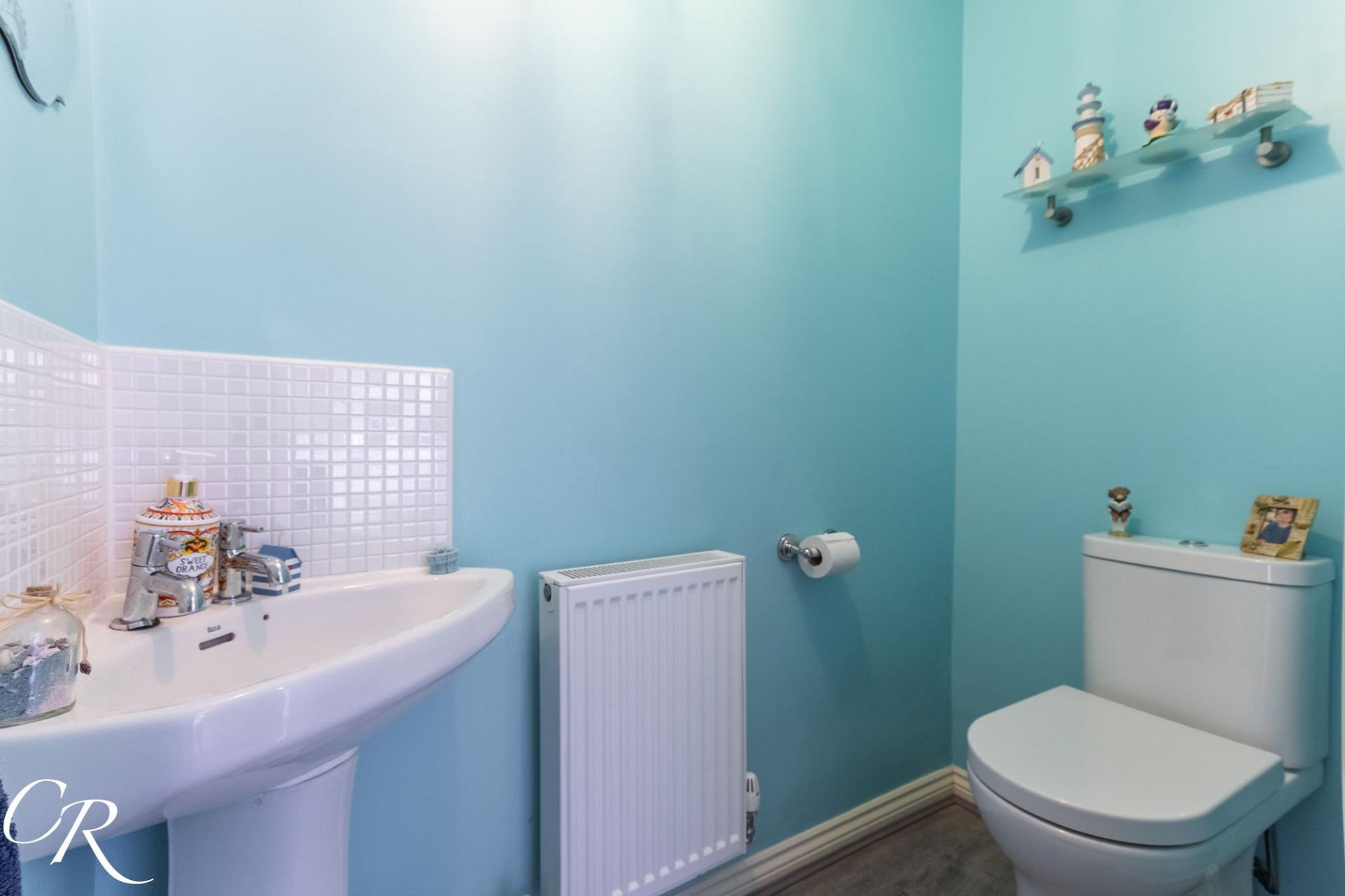 Cloakroom: A useful ground floor cloakroom fitted with a WC and wash-hand basin, finished in a clean and modern style.