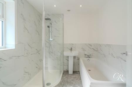 Bathroom: The bathroom is fitted with a modern suite comprising a panelled bath, separate shower enclosure, and wash basin. The space is fully tiled with a stylish finish.