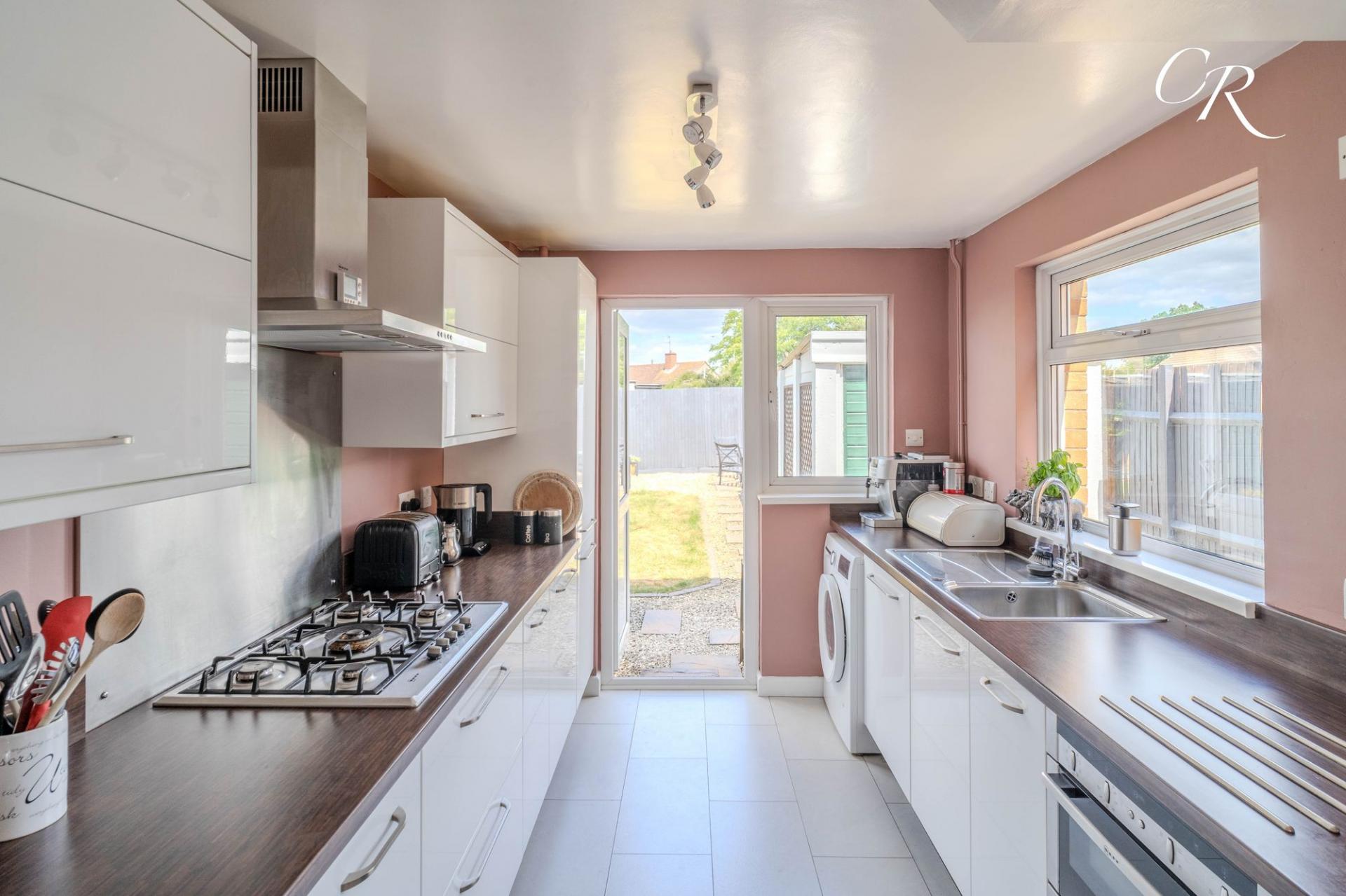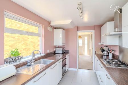 Kitchen: Set just off the dining area, and accessed via the hallway, the kitchen features a smart contemporary design with a range of stylish cabinetry, integrated oven and hob as well as an integrated fridge, freezer and dishwasher, and ample space for further freestanding appliances such as a washer / dryer. Sleek countertops finish the space, with a window overlooking the driveway and a door providing external access to the rear garden.