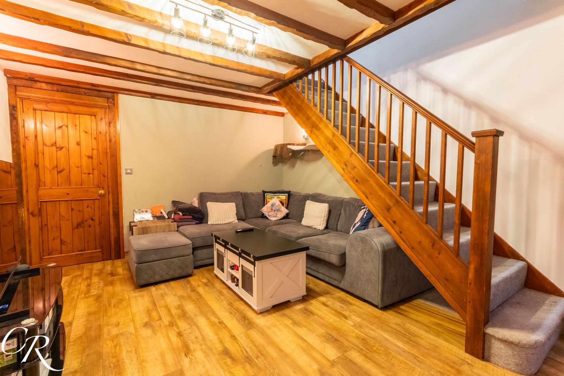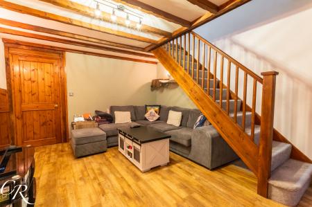 Sitting / Dining Room: A characterful and inviting reception space featuring exposed decorative timber beams and a staircase rising to the first floor. The room offers generous space for both seating and dining, with wood-effect flooring throughout and ample natural light from the rear window and glazed door, creating a warm and comfortable environment for everyday living and entertaining.