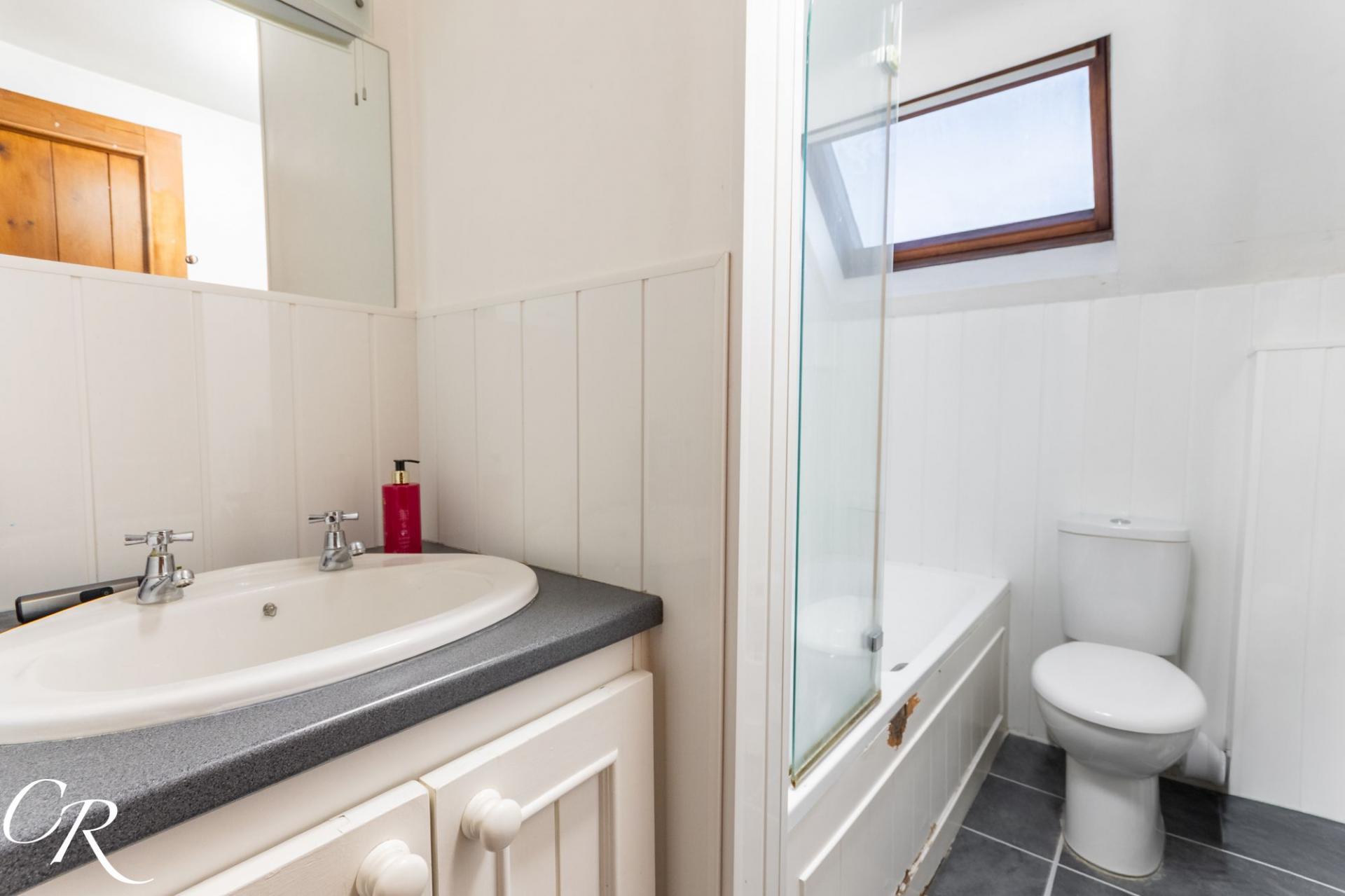Bathroom: Fitted with a white suite comprising a panelled bath with glazed shower screen and shower over, wash hand basin set into a vanity unit and WC. The bathroom is finished with part-panelled walls and benefits from a Velux-style window providing natural light and ventilation.