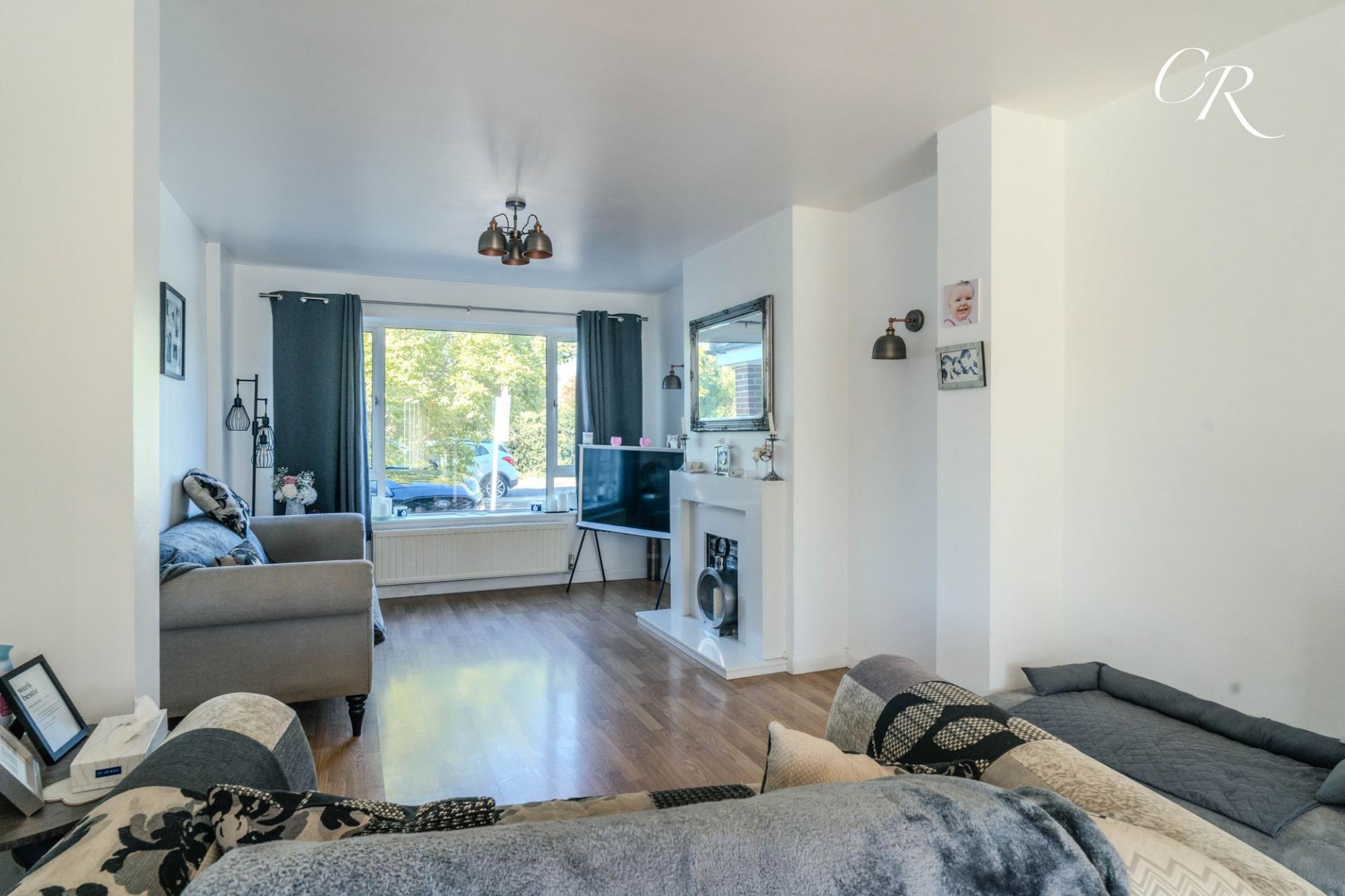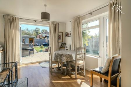 Sitting / Dining Room: A superb open-plan reception space extends from front to back, creating a bright and versatile living area. The sitting area is arranged around a feature fireplace and large front window, while the dining area enjoys views over the rear garden with French doors opening directly to the patio, perfect for entertaining or family life.