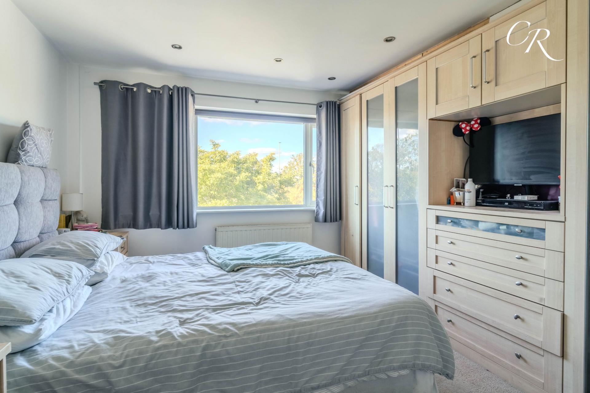 Bedroom One (Front): A generous principal bedroom positioned at the front of the house, beautifully presented and enhanced by bespoke built-in wardrobes offering extensive hanging and storage space. A large picture window allows plenty of natural light, making this room both practical and stylish.