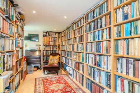 Library / Converted Garage: Currently used as a well-appointed library, this converted space offers extensive fitted shelving and recessed lighting, creating a peaceful environment for reading or working from home. The room offers flexibility to suit individual needs whether as a study, studio, or hobby room.
