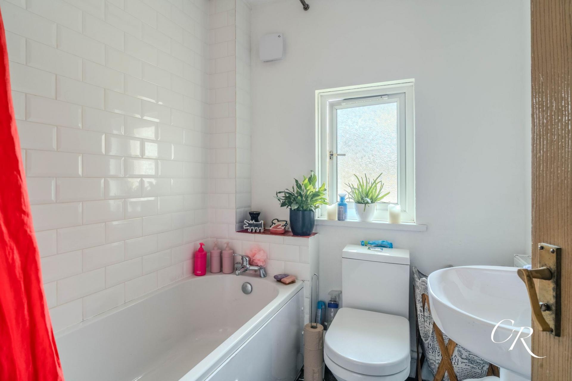Bathroom: The family bathroom is fitted with a white suite comprising a panelled bath with shower over, pedestal wash hand basin and WC. The space is finished with white tiled splashbacks, a frosted window for natural light and privacy, and neutral décor for a clean, contemporary feel.