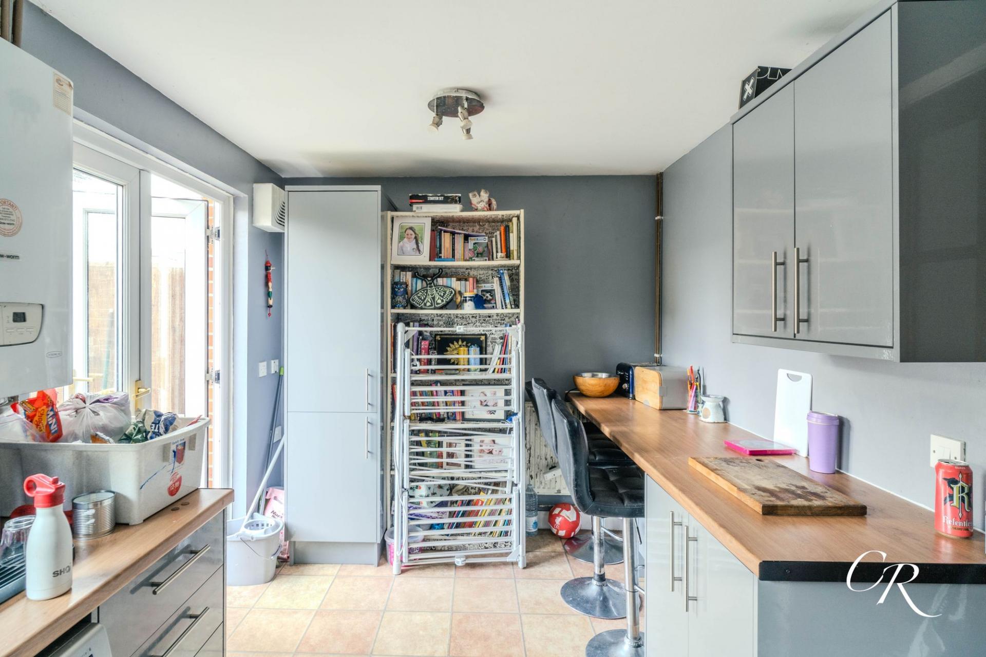 Kitchen/Dining Room: Set to the rear of the property, the kitchen/dining room provides a well-proportioned and practical space designed for modern living. Fitted with a range of contemporary grey wall and base units with wood-effect work surfaces, the kitchen includes space for a cooker, fridge/freezer, and washing machine. A breakfast bar creates a sociable area for casual dining, while tiled flooring enhances the room’s easy-care appeal. French doors open directly onto the garden, allowing natural light to pour in and providing a seamless connection between indoor and outdoor spaces.