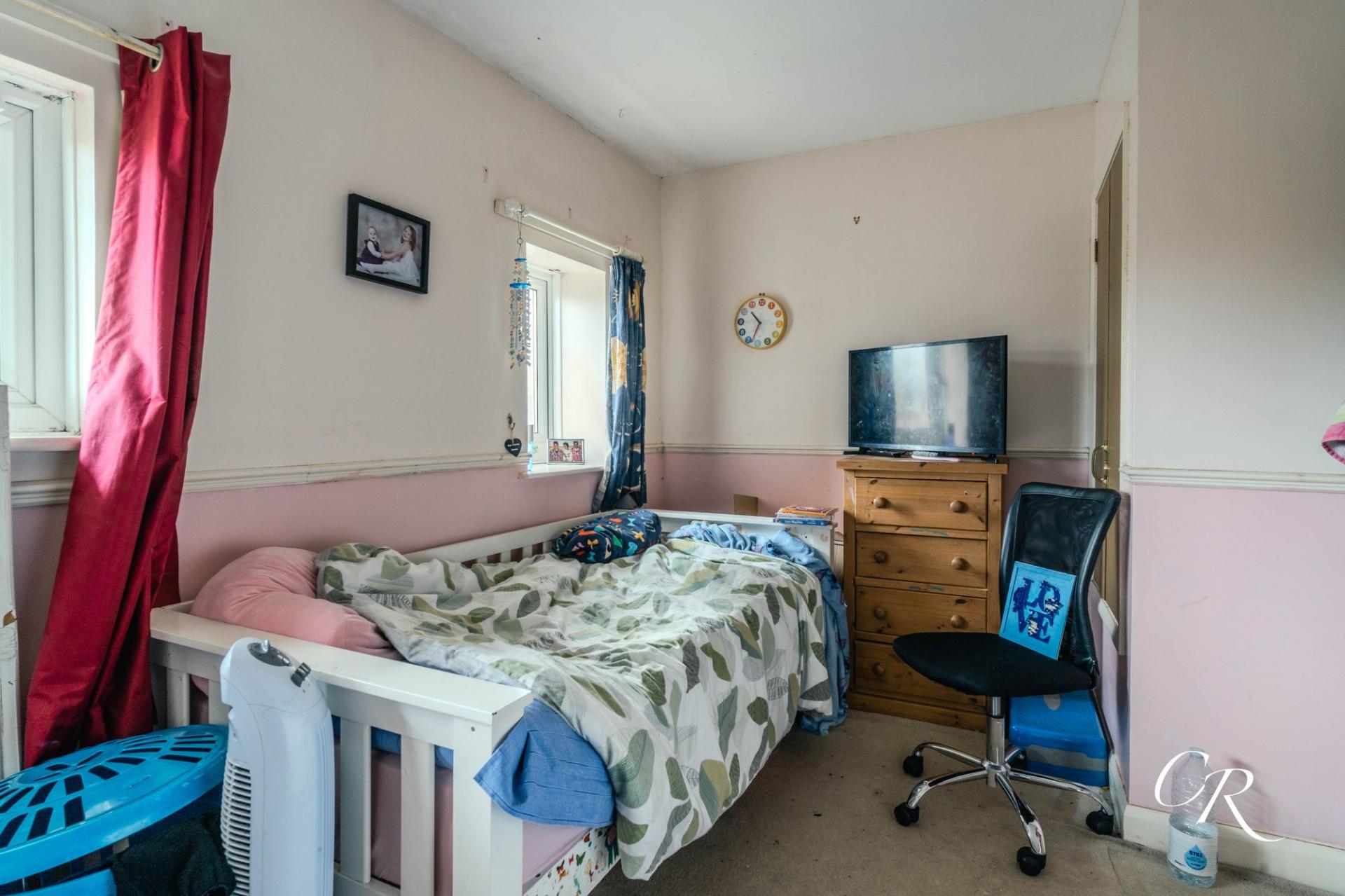 Bedroom One: Situated at the front of the property, the main bedroom is a comfortable double room featuring dual windows that allow excellent natural light to fill the space. The room offers ample space for freestanding furniture and is decorated in soft tones, making it a bright and versatile area that can be styled to suit personal taste.