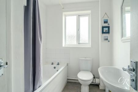 Bathroom: The bathroom comprises a panelled bath with shower over, pedestal wash basin, and WC. A rear window provides natural light and ventilation.
