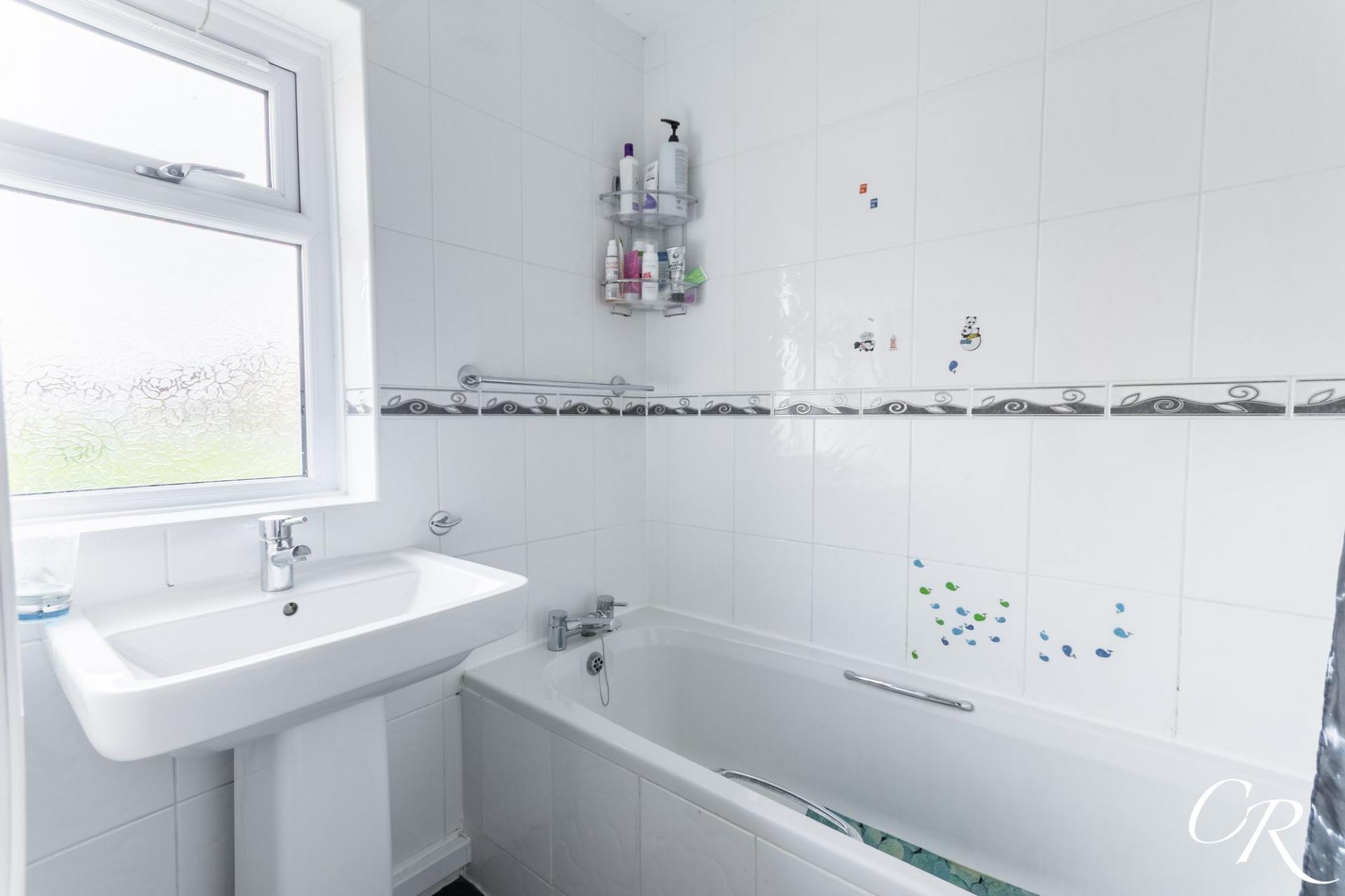 Family Bathroom: Fitted with a white suite comprising a panelled bath with shower over and wash hand basin, complemented by tiled walls and a window providing natural light.