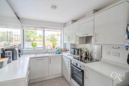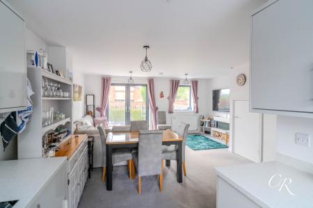 Kitchen, Sitting & Dining Area: Located on the ground floor and spanning the full width of the home, the open-plan living area is a bright and sociable space. The kitchen is fitted with sleek high-gloss white cabinetry, a built-in fridge/freezer, electric oven, hob, and extractor fan, plus an integrated dishwasher and washing machine. A large area remains for both lounge and dining furniture, with French doors leading directly to the rear garden, flooding the space with natural light and enhancing the indoor-outdoor connection.