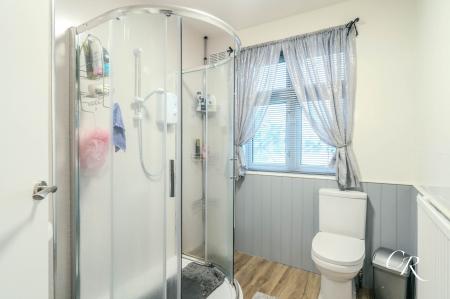 Shower Room: A neatly presented shower room comprising a semi - circular shower enclosure with an electric shower, WC, and wash basin. A large window brings in natural light while maintaining privacy, complemented by half-height panelling and practical flooring.