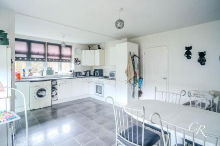 Kitchen/Dining Room: A spacious open-plan kitchen and dining area, ideal for modern family life. The kitchen offers a range of fitted units, good worktop space, and room for freestanding appliances, while the dining area provides ample space for a family table. Dual windows overlook the rear garden, creating a bright and welcoming setting for everyday meals and entertaining. A door leads directly into the utility room.