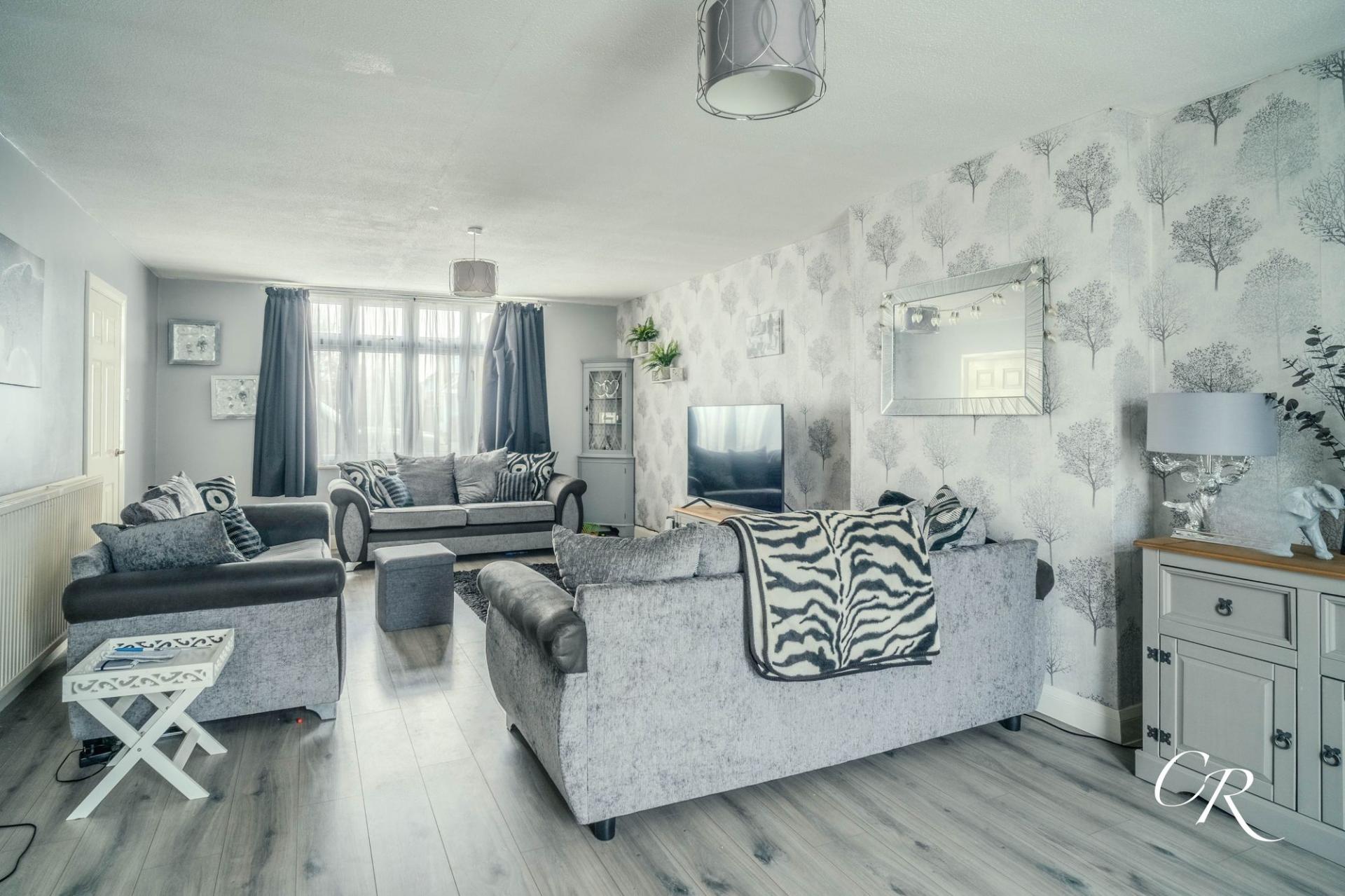 Sitting Room: A superbly sized dual-aspect reception room extending the full depth of the house. Bathed in natural light from the large front-facing window and rear glazed doors, this sociable space easily accommodates multiple seating arrangements. Finished with contemporary décor and feature wallpaper, it serves as an inviting area for everyday living and family gatherings.