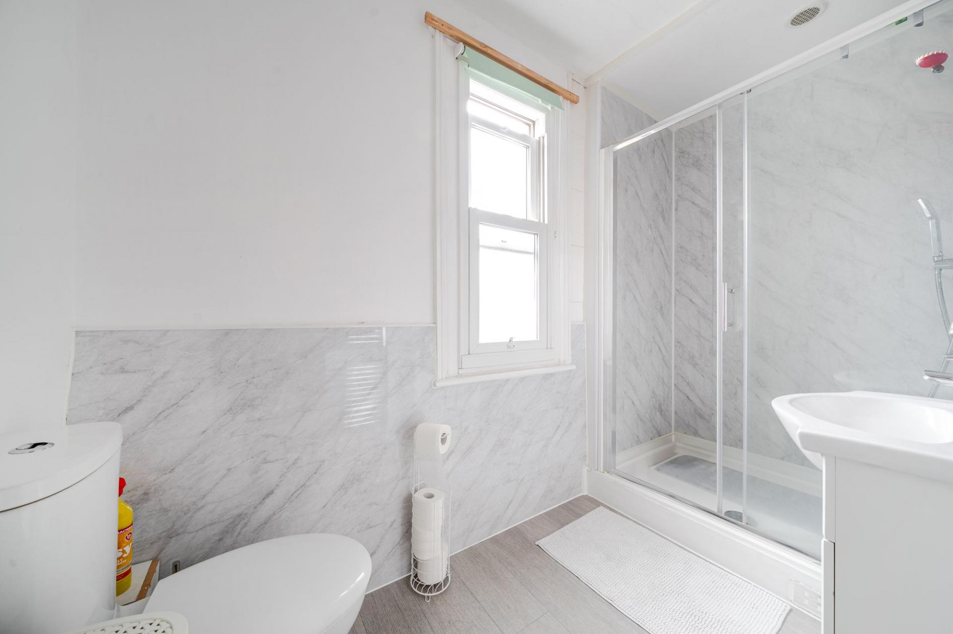Shower Room: The stylish shower room comprises a walk-in shower, wash basin, and WC, with tiled surrounds and a clean contemporary finish.