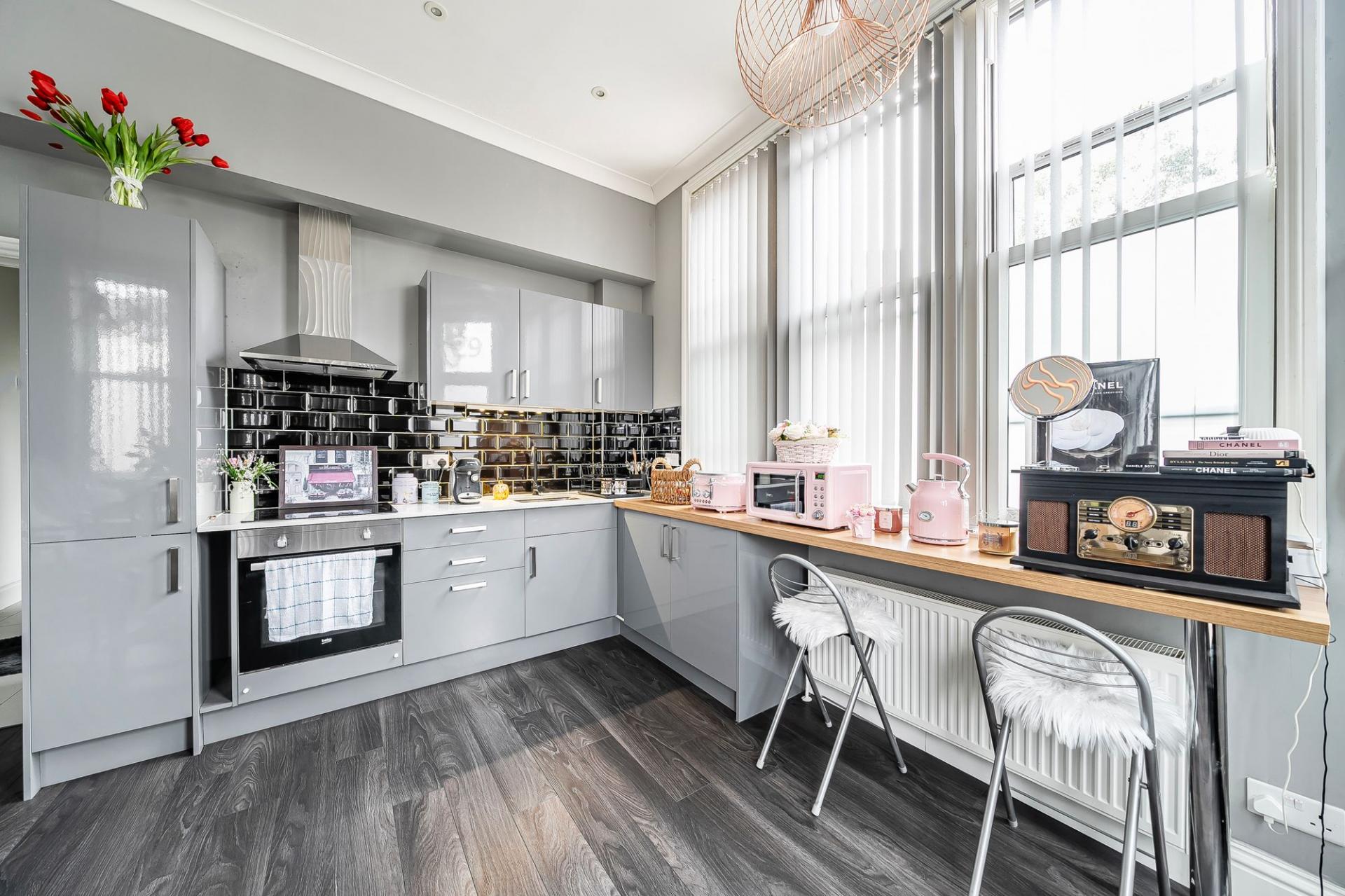 Bedroom Two: A second bedroom, positioned at the rear of the flat, also benefits from neutral décor and modern laminate flooring.