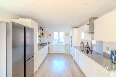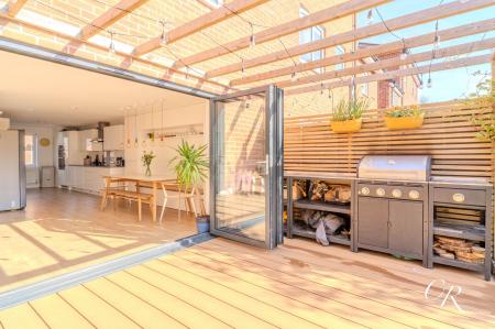 Kitchen / Dining and Family Room: Beautifully finished for modern family living, the contemporary kitchen boasts a range of stylish white gloss cabinetry, sleek grey worktops, integrated appliances, and a smart tiled splashback. This stunning open-plan space is perfect for socialising, featuring a large dining and family area ideal for everyday living and entertaining. Flooded with natural light, the family space opens through bi-folding doors onto a generous south-facing decked patio area, creating a seamless connection between indoor and outdoor living.