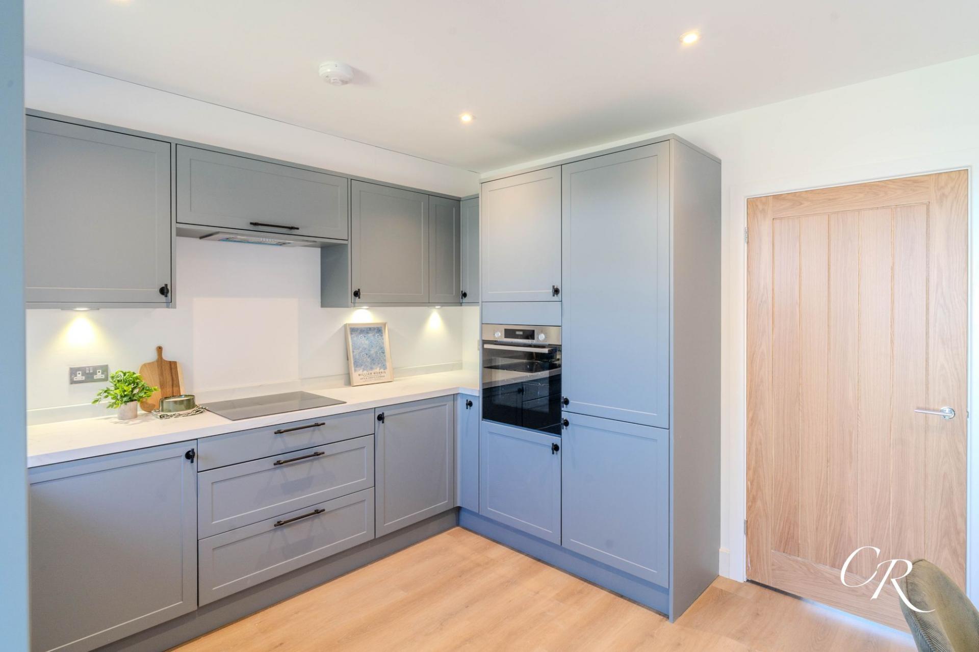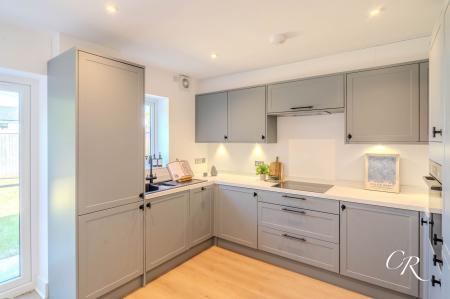 Kitchen: The kitchen is finished in a modern yet classic style, featuring sleek cabinetry with country style black handles and under cabinet lighting for a clean, contemporary look. It includes an integrated Bosch oven, electric hob, extractor fan, integrated fridge freezer, and a pull out storage rack. Ample worktop space and stylish splashbacks complete this bright and functional space, ideal for everyday use.