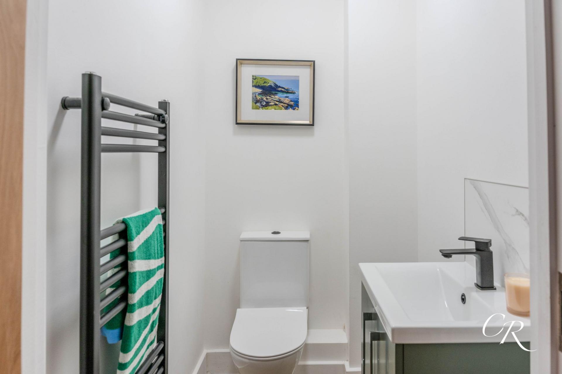 Main Bathroom: The main bathroom is finished to a high standard with contemporary neutral tiling and sleek fittings. It features a panelled bath with a glass screen and overhead shower, a wall mounted basin with vanity storage, and a low level WC. A heated towel rail and recessed lighting complete the clean, modern look.