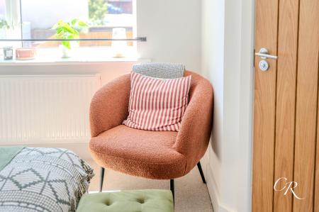 Living Room: At the front of the property, the sitting room is bright and welcoming, featuring a charming bay window that enhances the natural light and provides a cosy spot for reading or relaxing. Finished in soft neutral tones and wood effect flooring, this space sets the tone for the home’s elegant and modern aesthetic.