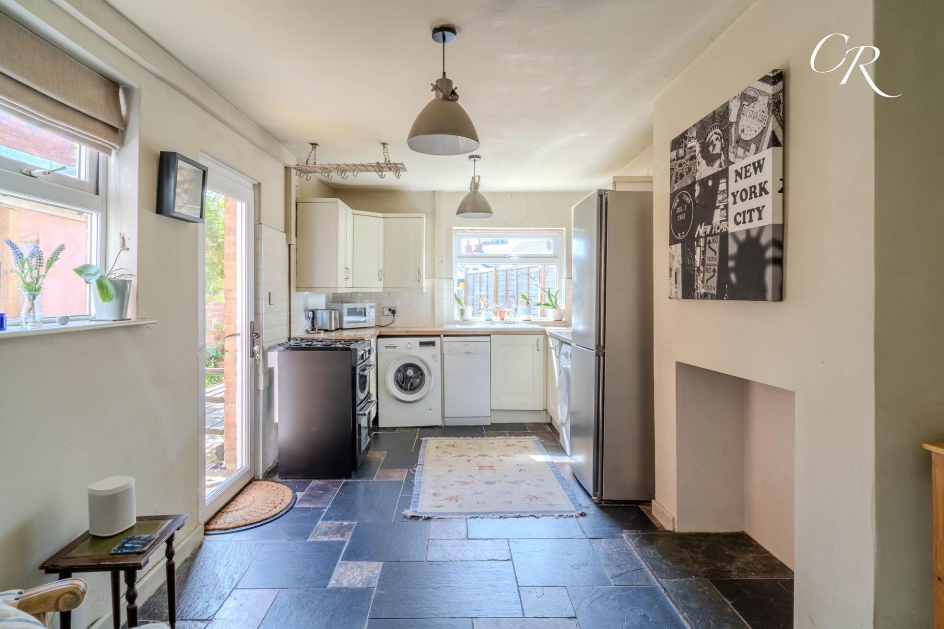 Kitchen: Set at the rear of the home, the kitchen is a bright and functional space fitted with a range of cabinetry and worktops. There is space for a washing machine, dishwasher, tumble dryer and cooker. A door provides direct access to the rear garden and to the front of the property,