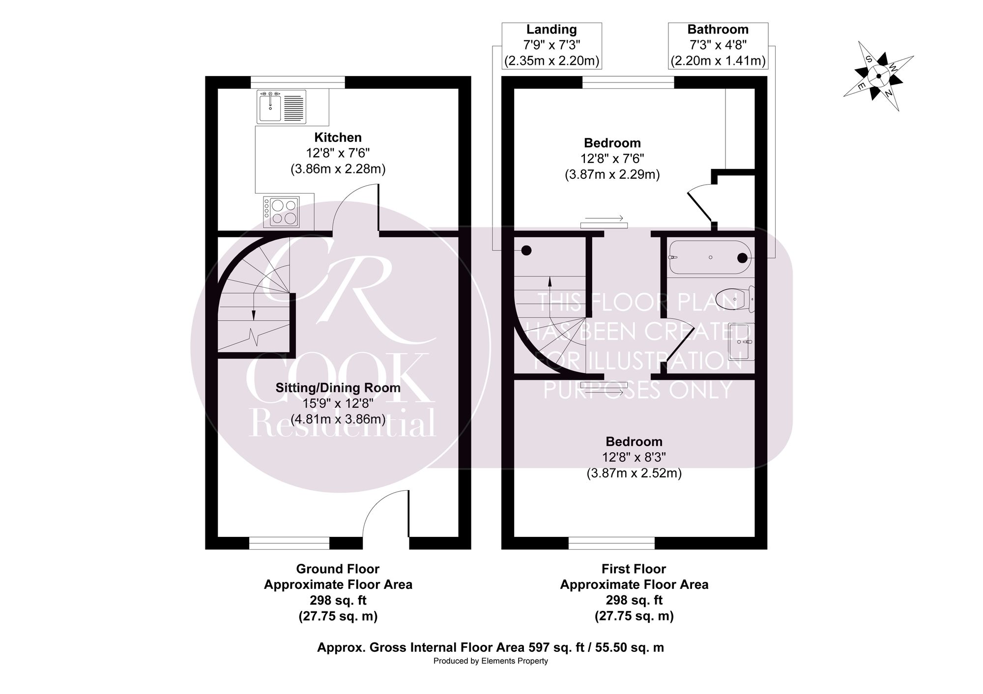 Landing: The spiral staircase leads to the first-floor landing, which provides access to both bedrooms and the bathroom.