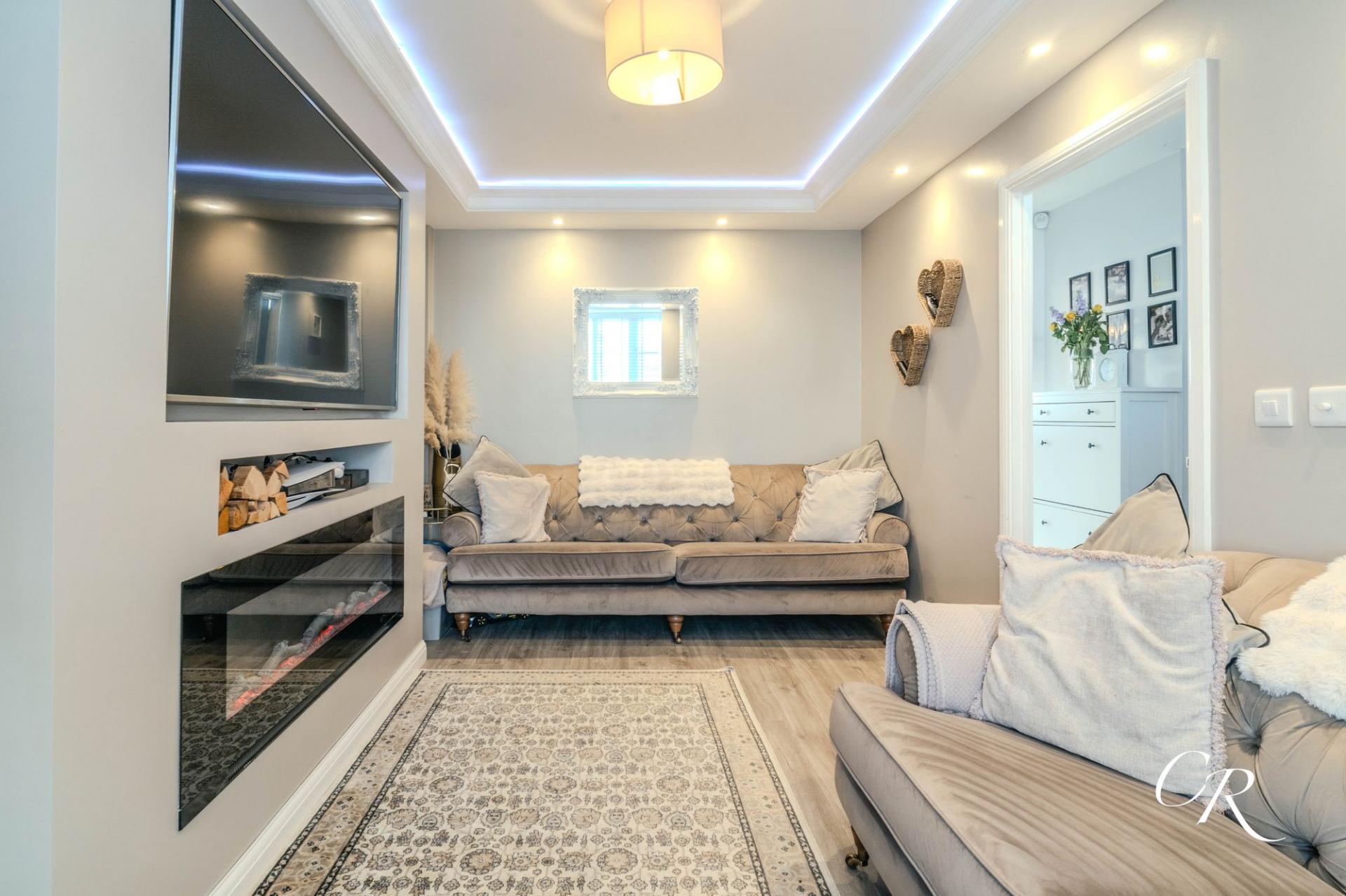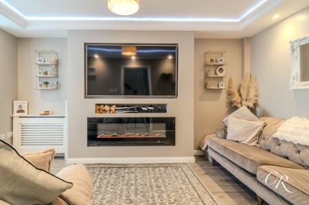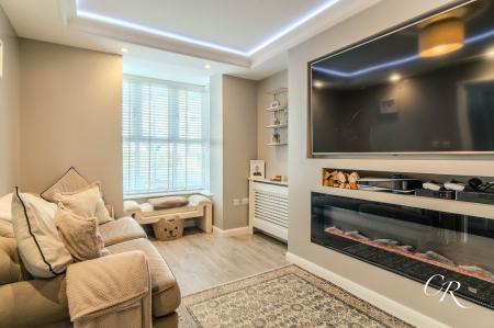 Living Room: Positioned to the front of the property, the living room is an elegant and cosy space featuring a large window, inset media wall with feature fireplace, and ceiling spotlights. The room provides ample space for soft seating and is beautifully finished.
