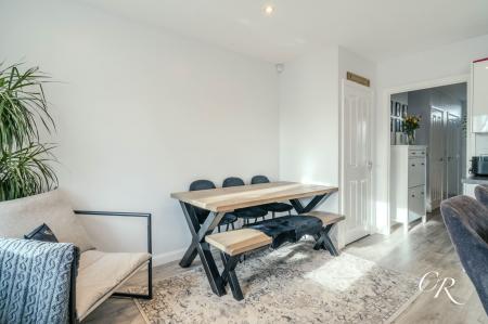 Hallway: The entrance hallway offers a welcoming first impression with wood-effect flooring, space for furniture, and access to the ground floor accommodation. There is a built-in cupboard ideal for coats and shoes, along with useful under-stairs storage which has plumbing for a washing machine.