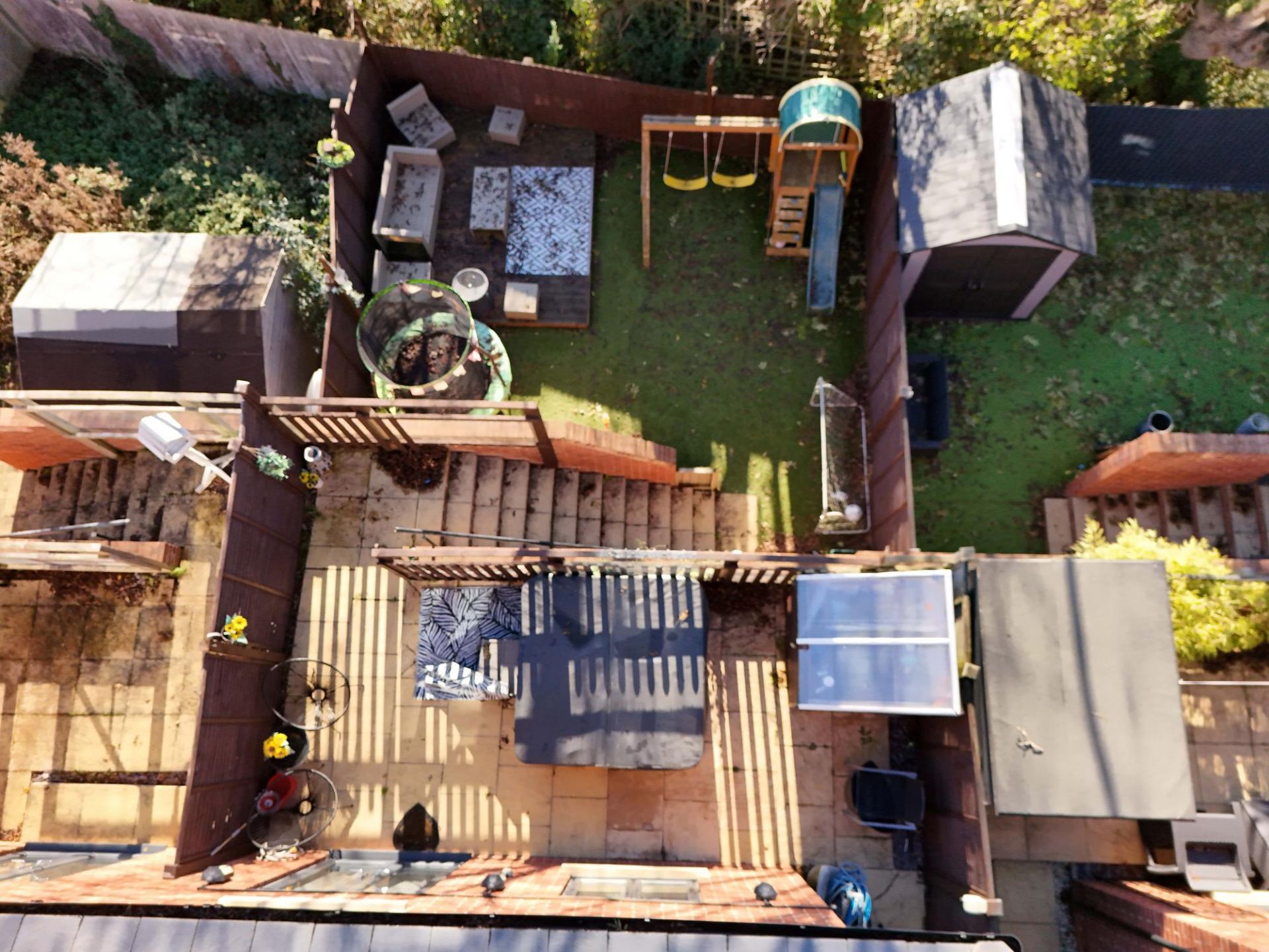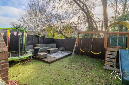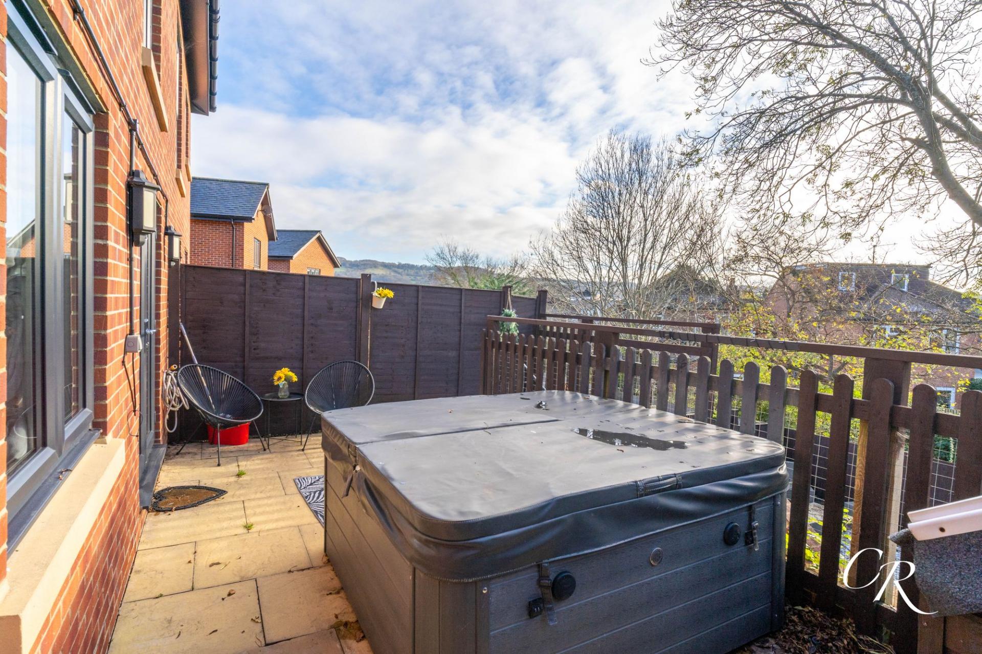 Rear Garden: The enclosed rear garden is arranged over two levels. The upper terrace provides a paved patio area with space for seating and a hot tub, while steps lead down to the lower garden, which includes artificial lawn and further seating areas. There is side access leading directly out to the driveway, making this a practical and family-friendly garden.