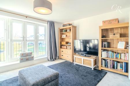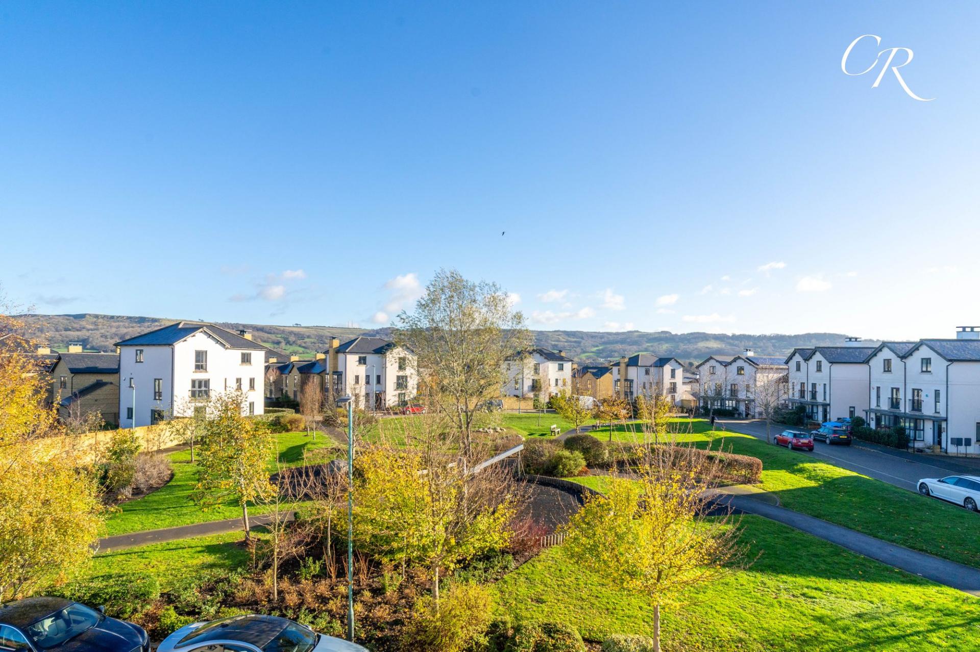 Living Room: An impressive reception room enjoying floor-to-ceiling windows with Juliet balconies and lovely views across the landscaped green space and towards the hills. A generous, inviting room perfect for relaxation or entertaining.