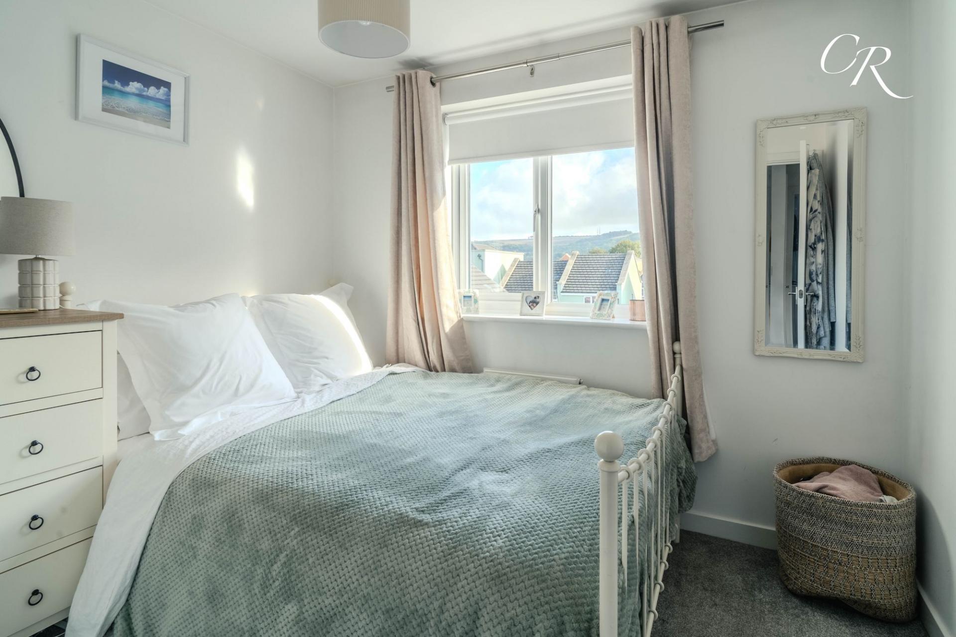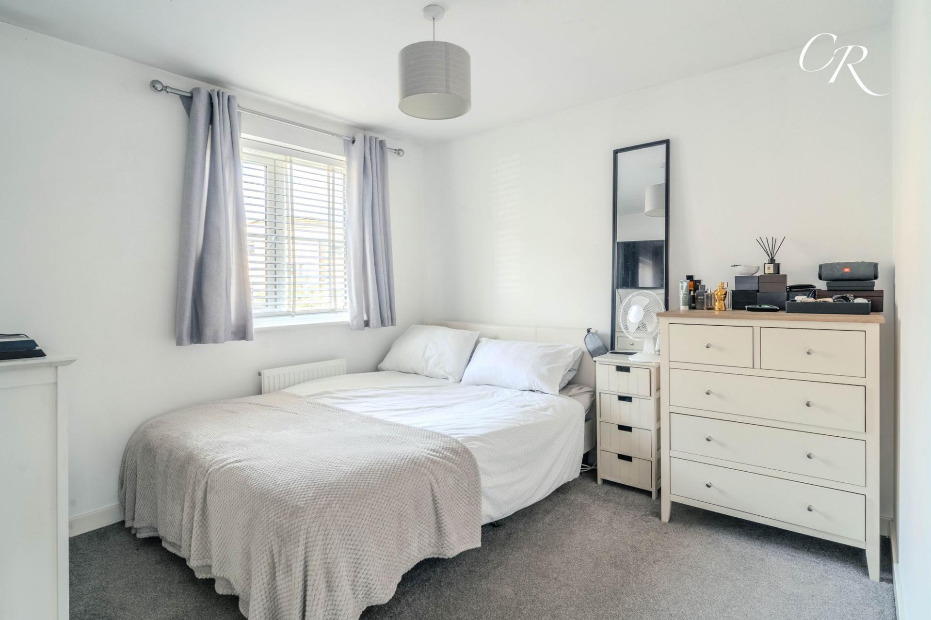 Bedroom Two: Another comfortable double bedroom with a front-facing aspect, currently styled with neutral tones and soft furnishings. A flexible space equally suited as a guest room or family bedroom.