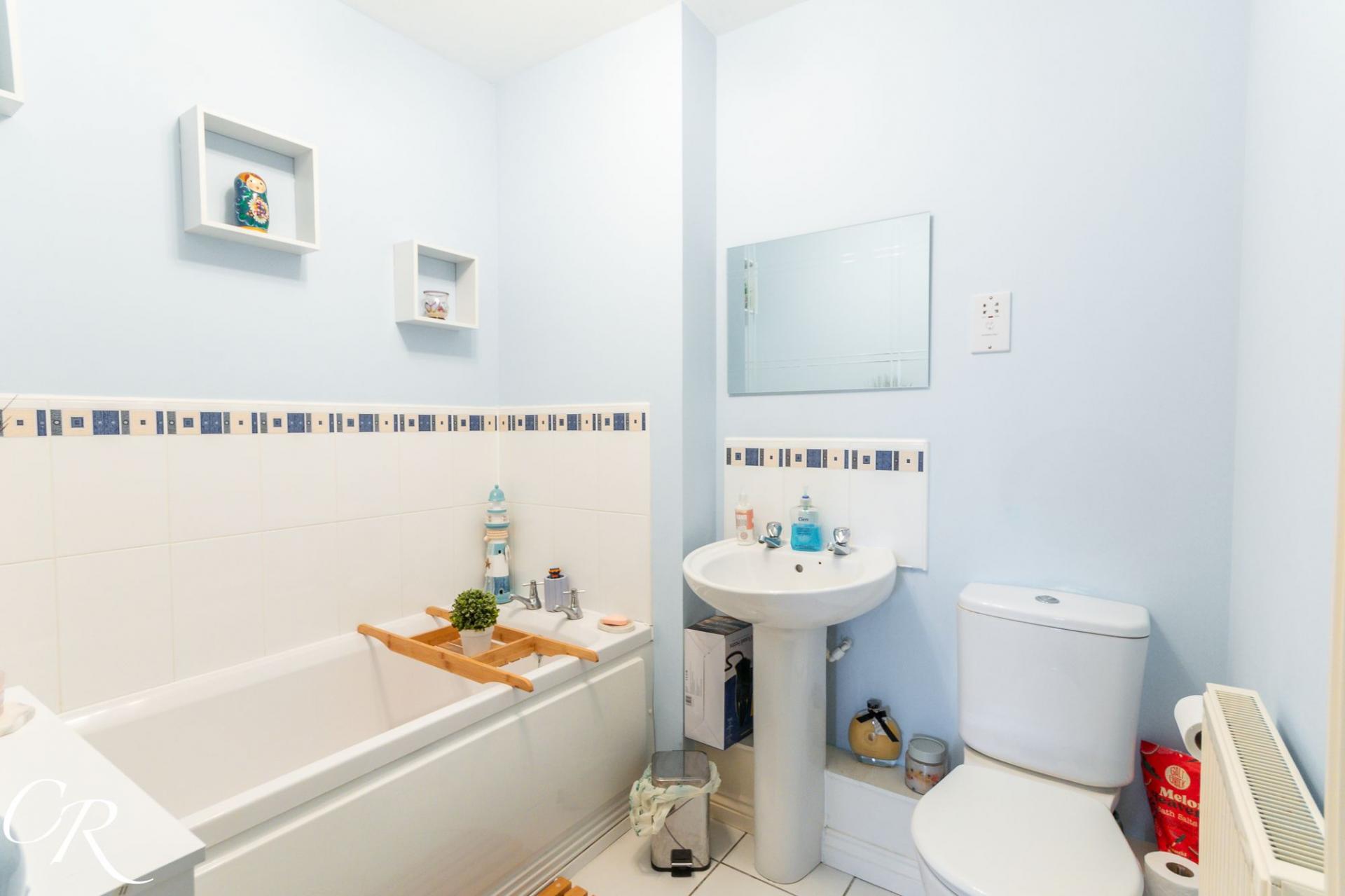 Family Bathroom: A well-appointed bathroom comprising a panelled bath with shower over, WC and wash hand basin, finished in light, neutral tones.