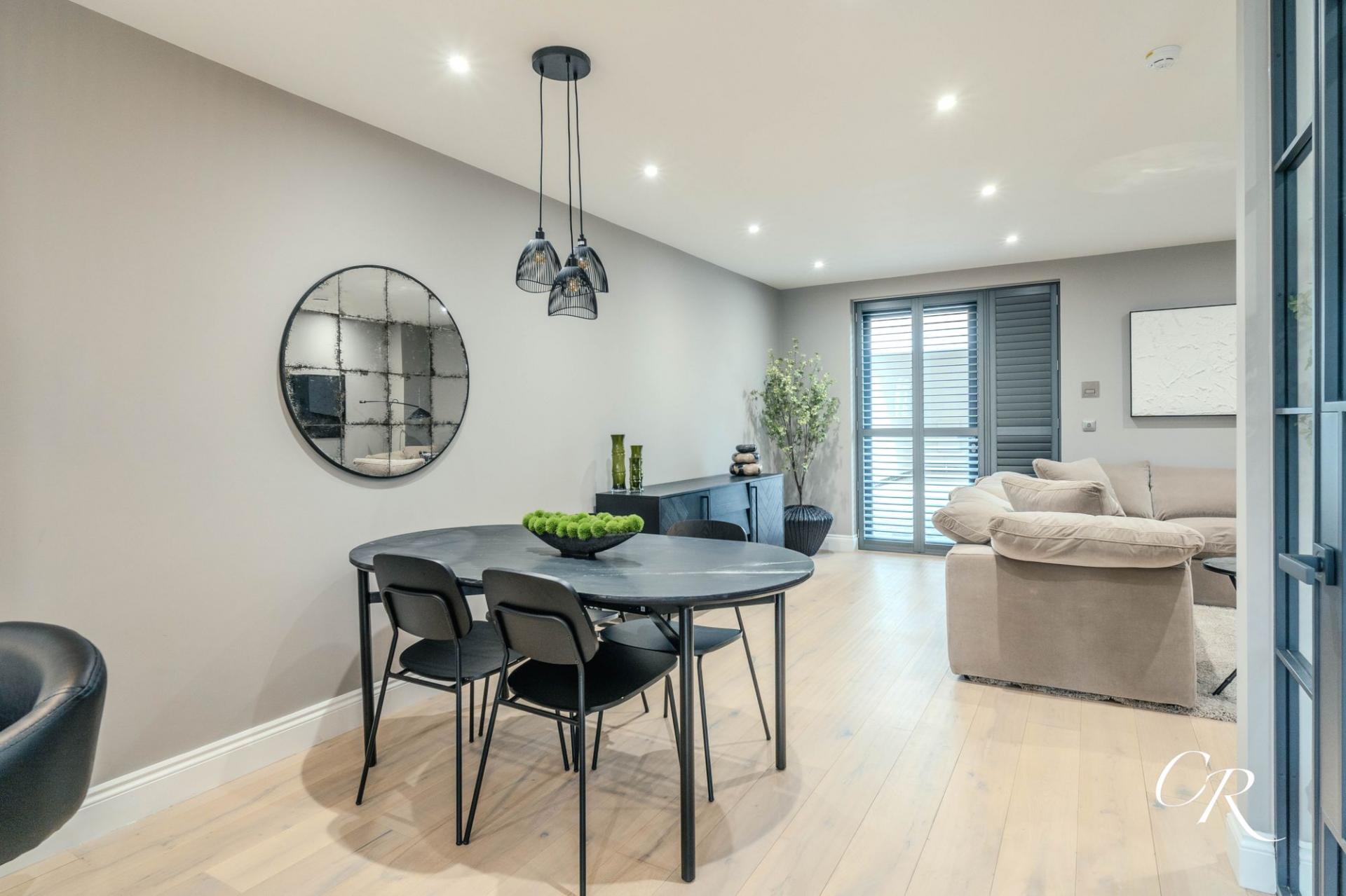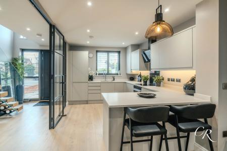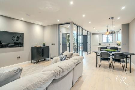 Kitchen/Dining/Sitting Room: Spanning the full depth of the property, this impressive open-plan space offers an ideal setting for modern living and entertaining. The sleek designer kitchen is fitted with soft-close cabinetry, high-specification integrated appliances, and quartz-effect worktops. A peninsula breakfast bar provides casual seating, while the dining area easily accommodates a full-size table. The sitting area is positioned to the rear with contemporary glazing allowing light to pour through. The entire space benefits from underfloor heating and recessed lighting, creating a seamless, warm atmosphere that perfectly complements the home’s modern aesthetic.
