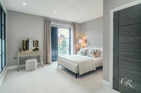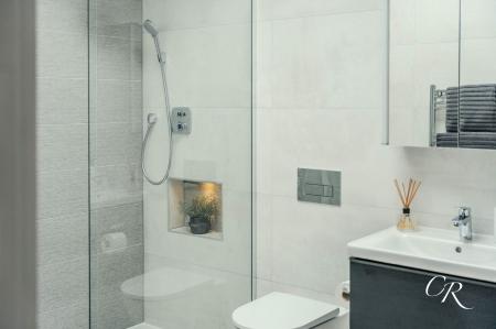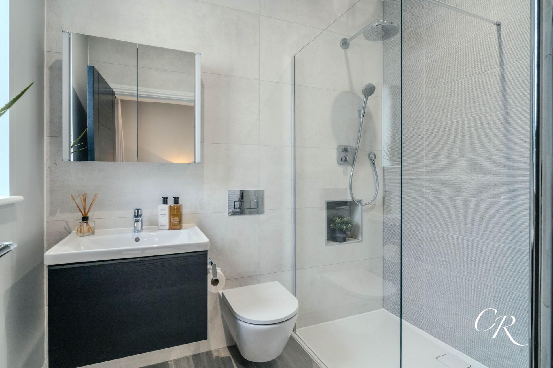 Bedroom Three: Positioned on the first floor, this spacious double room features built-in mirrored wardrobes, a Juliet balcony, and a sleek ensuite shower room. The ensuite is finished with contemporary tiling, a wall-hung vanity unit, and a walk-in shower with rainfall head and niche lighting.
