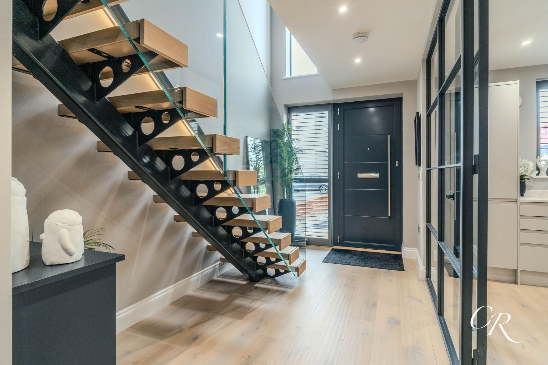 Hallway: The home opens into a bright and striking hallway featuring engineered oak flooring, underfloor heating, and a bespoke open-tread staircase with glass balustrade and integrated lighting. Full-height windows flood the space with natural light, and glazed doors lead through to the open-plan kitchen, dining, and sitting area, setting the tone for the sophisticated design throughout.