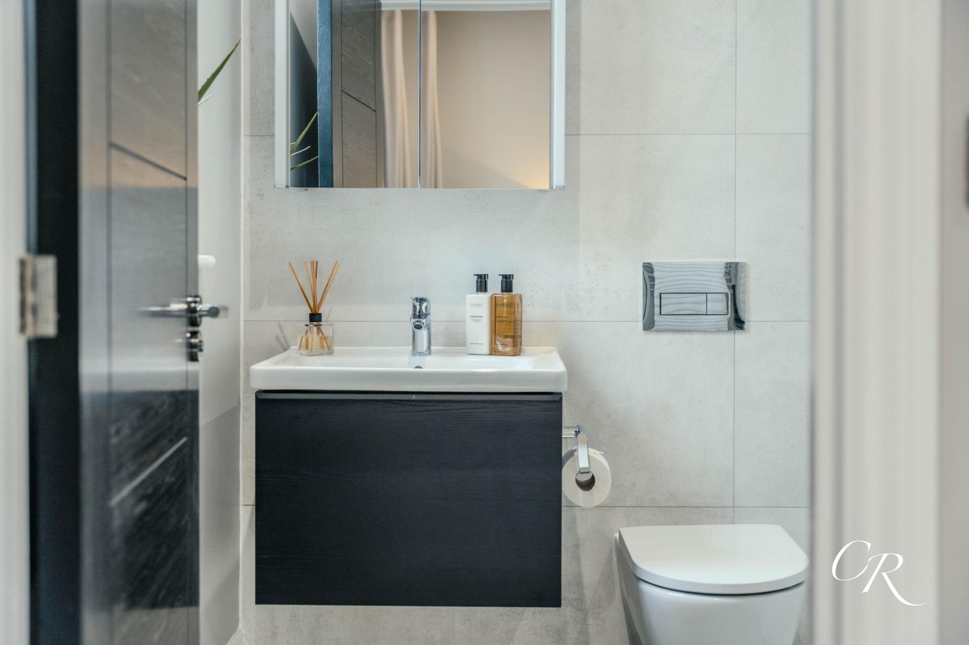 Cloakroom: A stylish cloakroom is located off the hallway and features a wall-mounted vanity unit with basin, WC, and large-format tiling in a neutral palette.