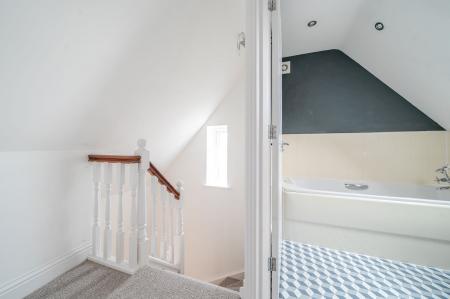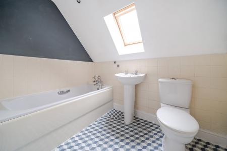 Bathroom: The family bathroom is positioned on the first floor and comprises a panelled bath with shower over, WC, and wash basin. The space is bright and neatly finished with neutral tiling.