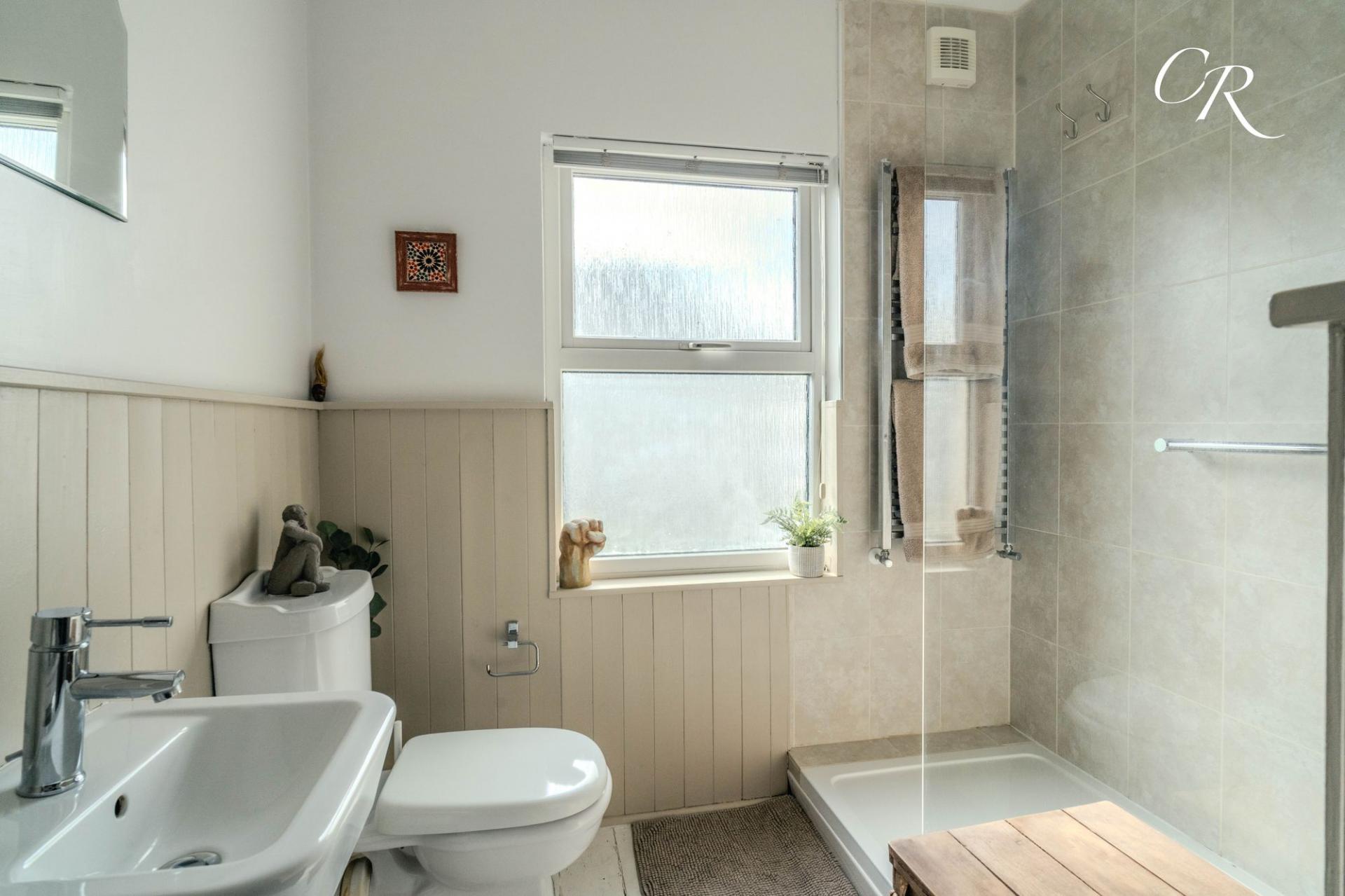 Shower Room: The first-floor shower room is fitted with a modern white suite comprising shower enclosure, WC, and wash hand basin. Finished with part-wood panelling, neutral tiling, and a heated towel rail, the space is bright, fresh, and functional.
