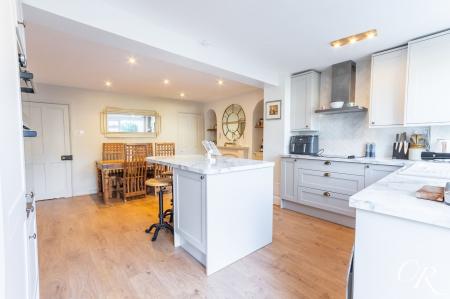 Kitchen: The modern kitchen has been thoughtfully designed with shaker-style cabinetry, marble-effect worktops and a central island with breakfast seating. Integrated double oven, hob and extractor are complemented by further appliance space. A large rear window overlooks the garden and French doors provide direct access outside, creating an ideal indoor-outdoor connection.